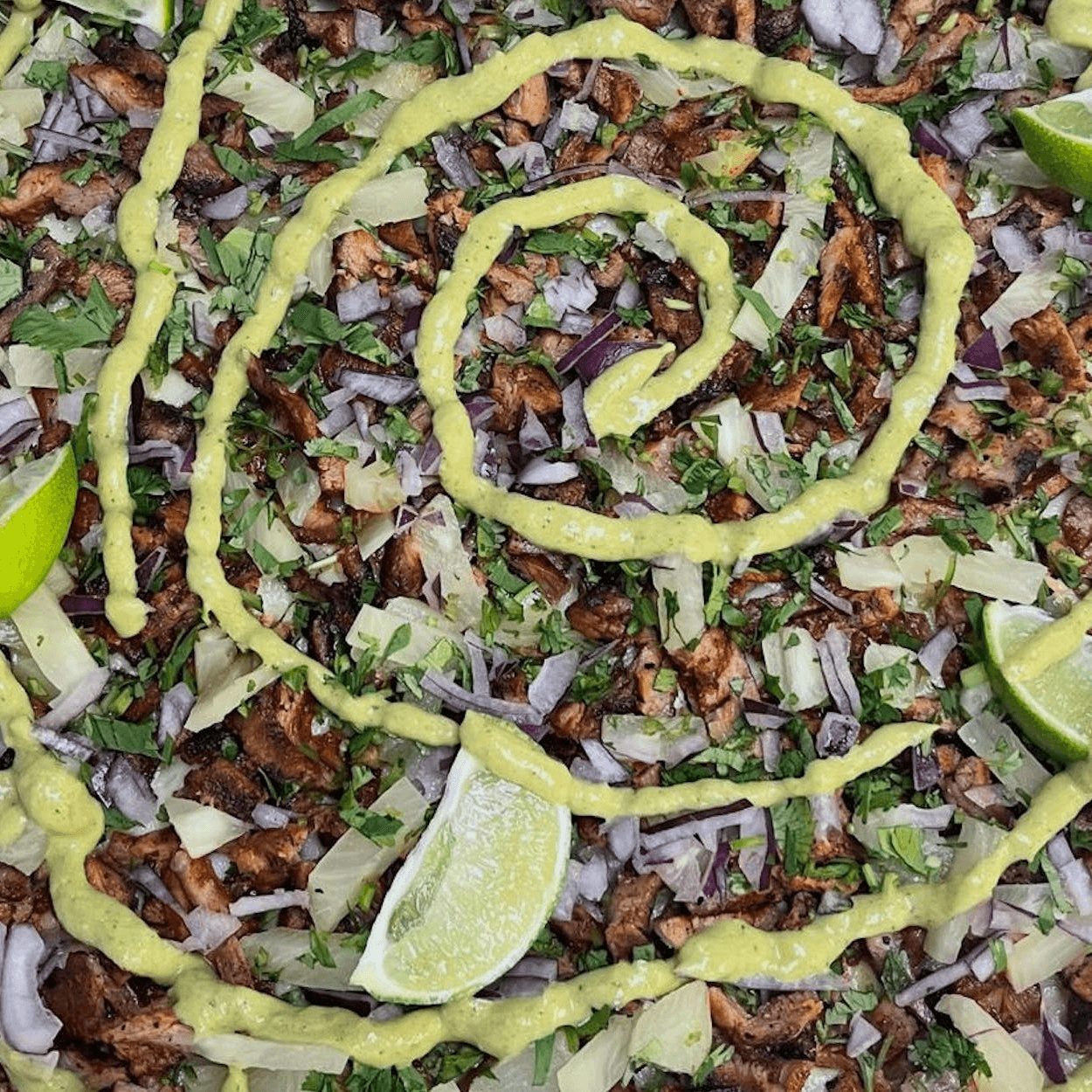 16". Marinated pork and sweet pineapple topped with cilantro and red onions, served with lime and a spicy green sauce on the side.