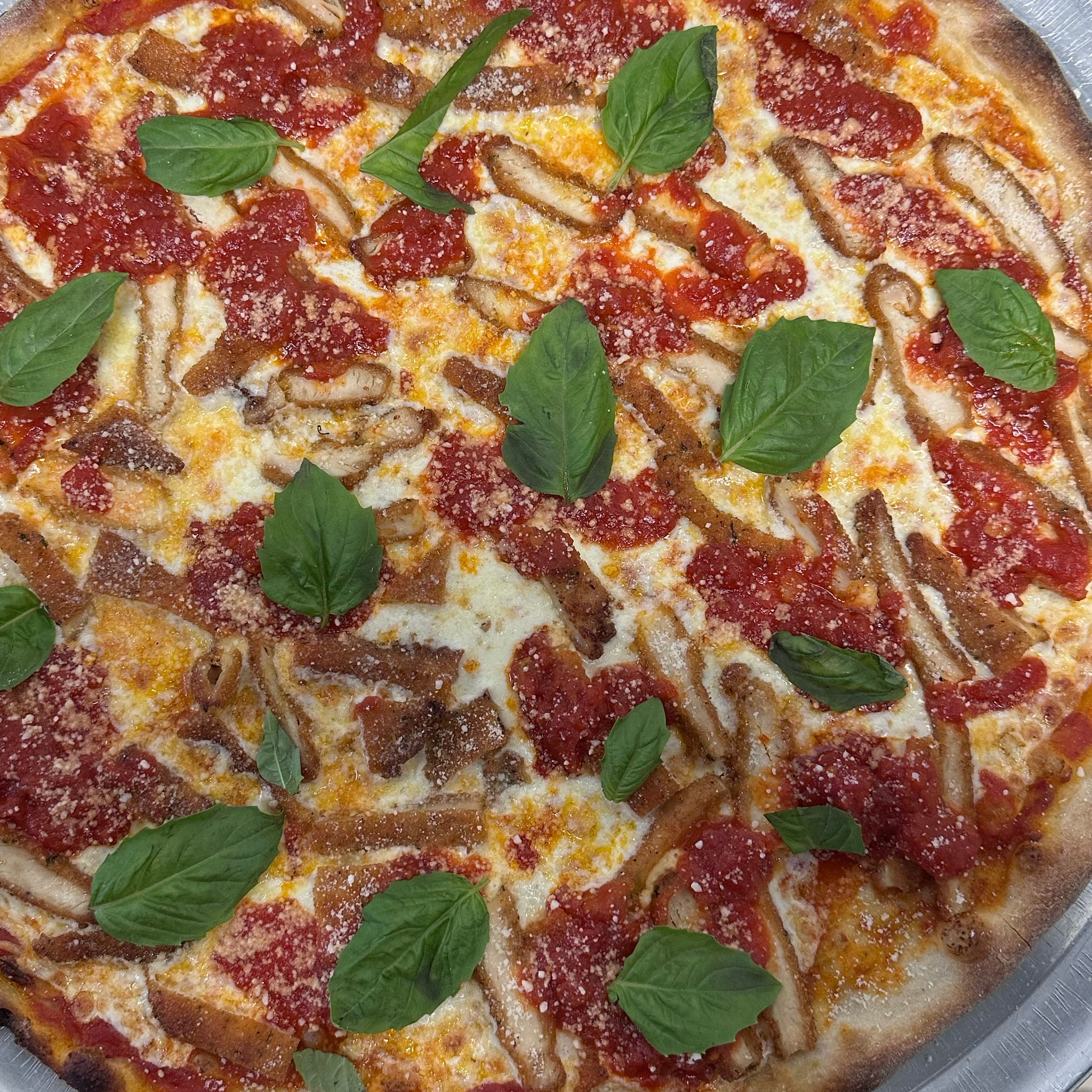 Breaded chicken, vodka sauce, fresh mozzarella cheese, basil, and Parmesan cheese.