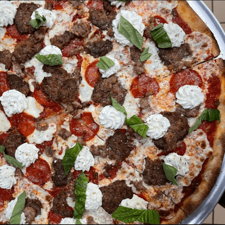 Tomato sauce, pepperoni, fennel sausage, meatballs, fresh mozzarella, basil, and ricotta.